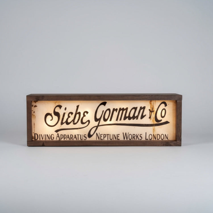 Gorgeous handmade retro illuminated reproduction vintage Siebe Gorman Divers sign made from solid wood and illuminated with soft glow lighting.