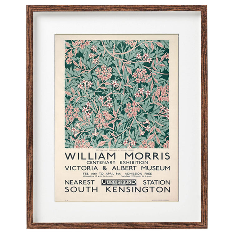 Framed poster with floral design and text about William Morris exhibition at Victoria & Albert Museum.